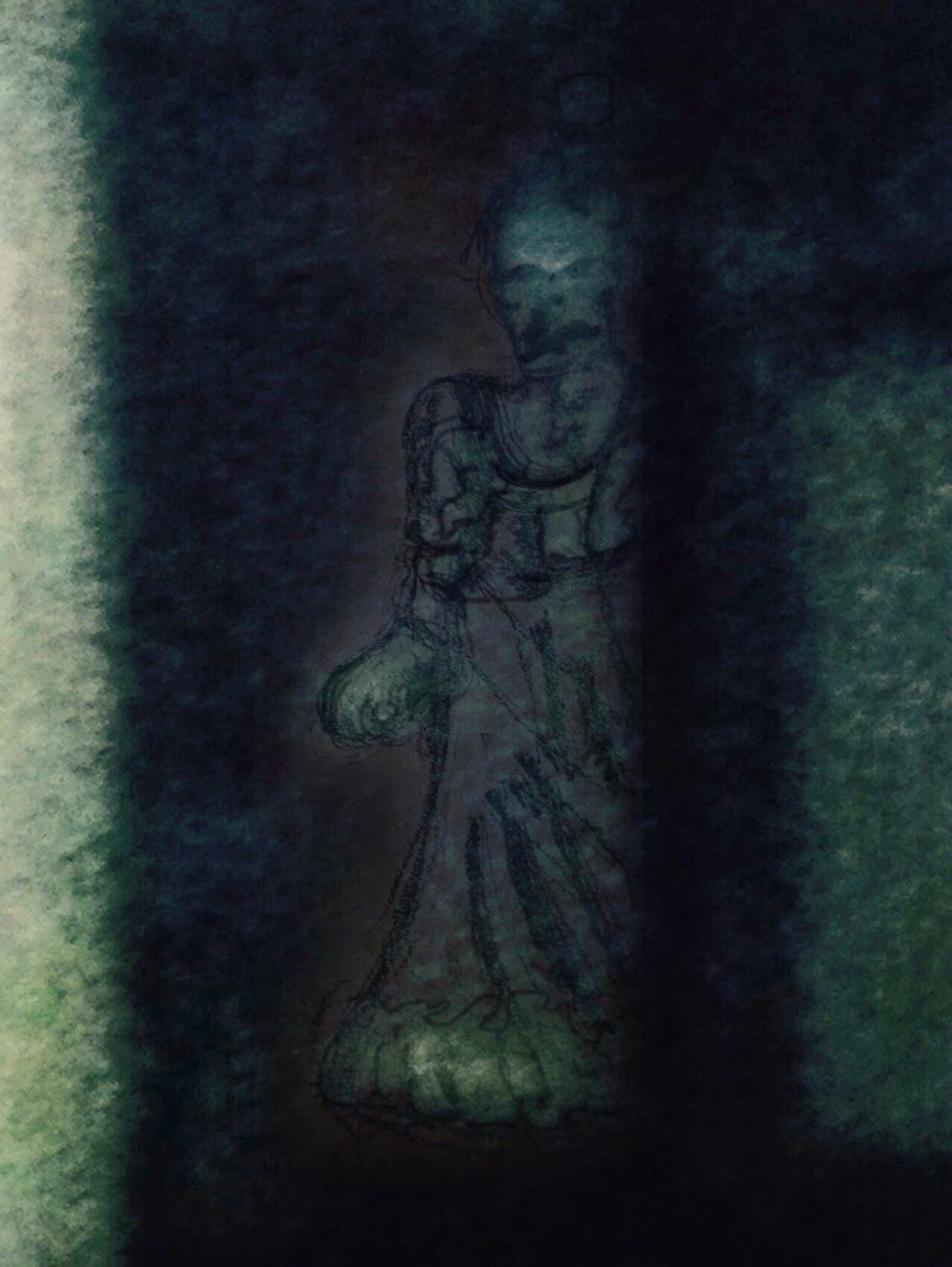 EMMA, THE MURDERED GIRL? (below): Is this the image of the ghost of the young girl ‘Emma’ reported to be in residence at 30 East Drive? Shot in the darkness from the small bedroom toward the upstairs bathroom, we can make out the definite line of a dress like garment as the girl inquisitively leans out of the bathroom door and wonders why someone is sat in ‘her’ room uninvited? Or is the line of the dress actually that of a Habit and is an image of the Black Monk himself? A reconstruction of the entity can be seen below. Photographer: Amanda M
