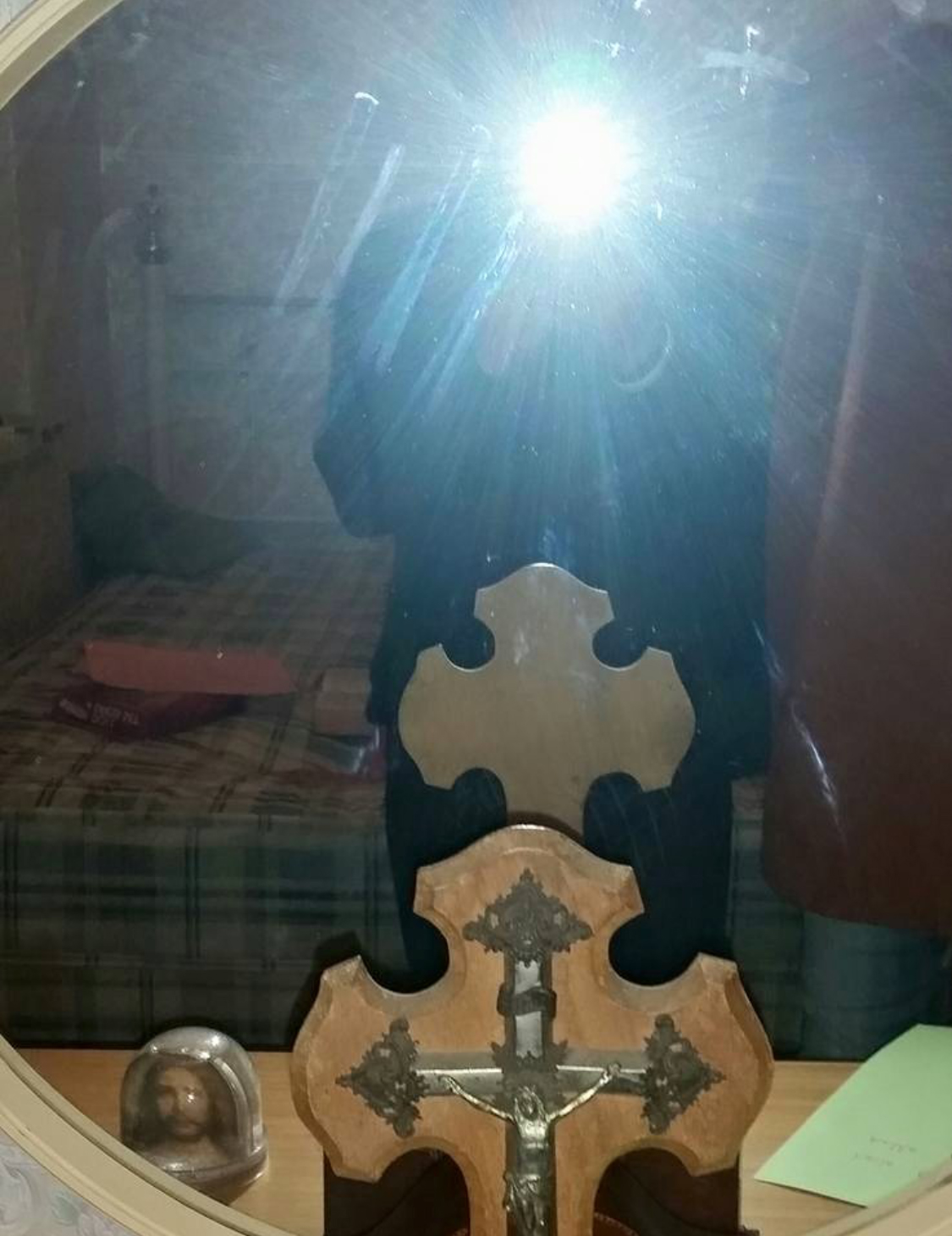 HE’S BEHIND YOU! (below): Anecdotal evidence suggests that poltergeists are very difficult to capture on film, presumably because they are a little camera shy? But what if they see that the camera is pointing the other way? Into a mirror! This very interesting photo taken of the mirror on the upstairs make-up table seems to hide a very convincing form of a monk’s habit? Can you spot him? There is an enlargement below the original image posted here. Photographer: Friend of Jordan P