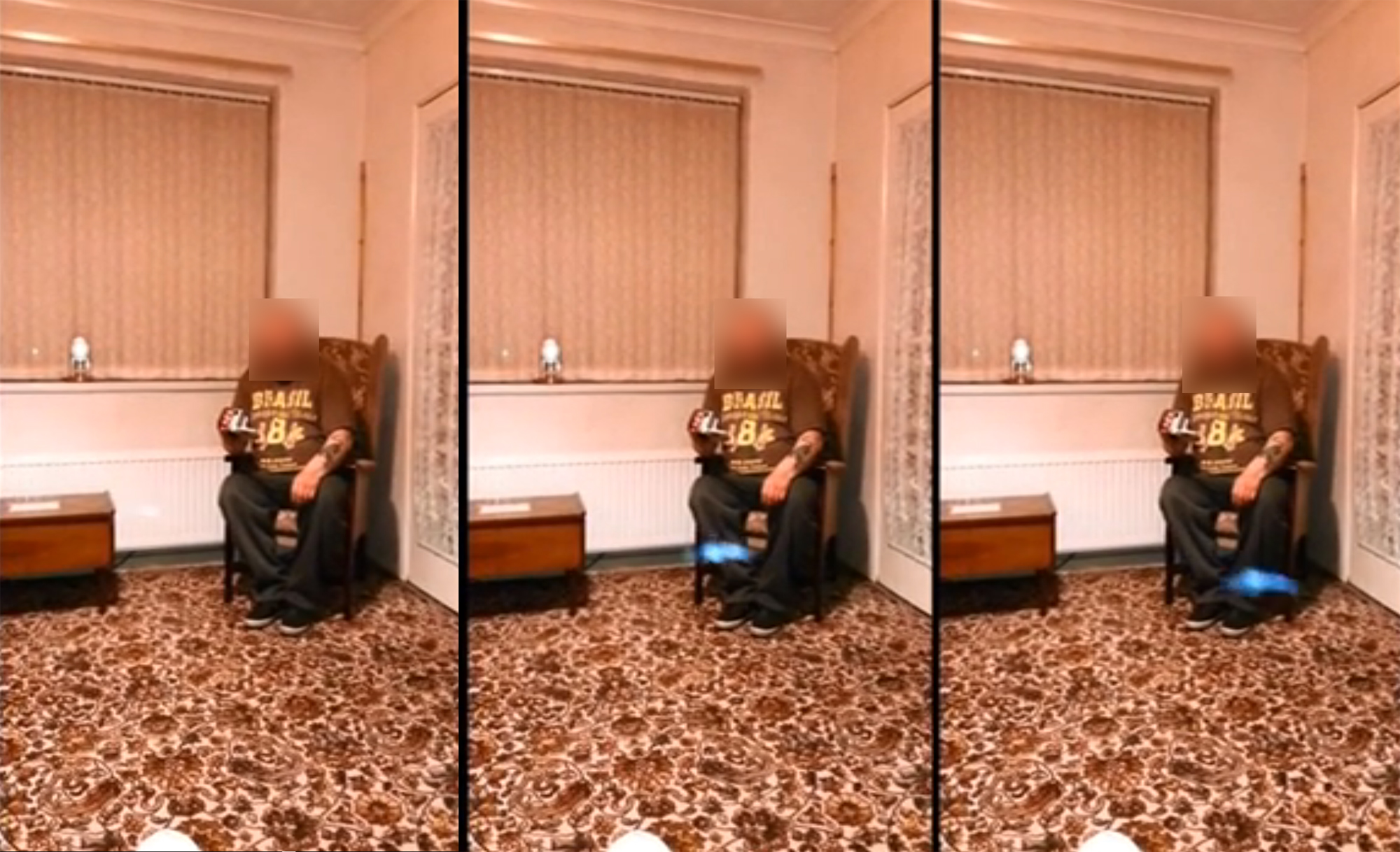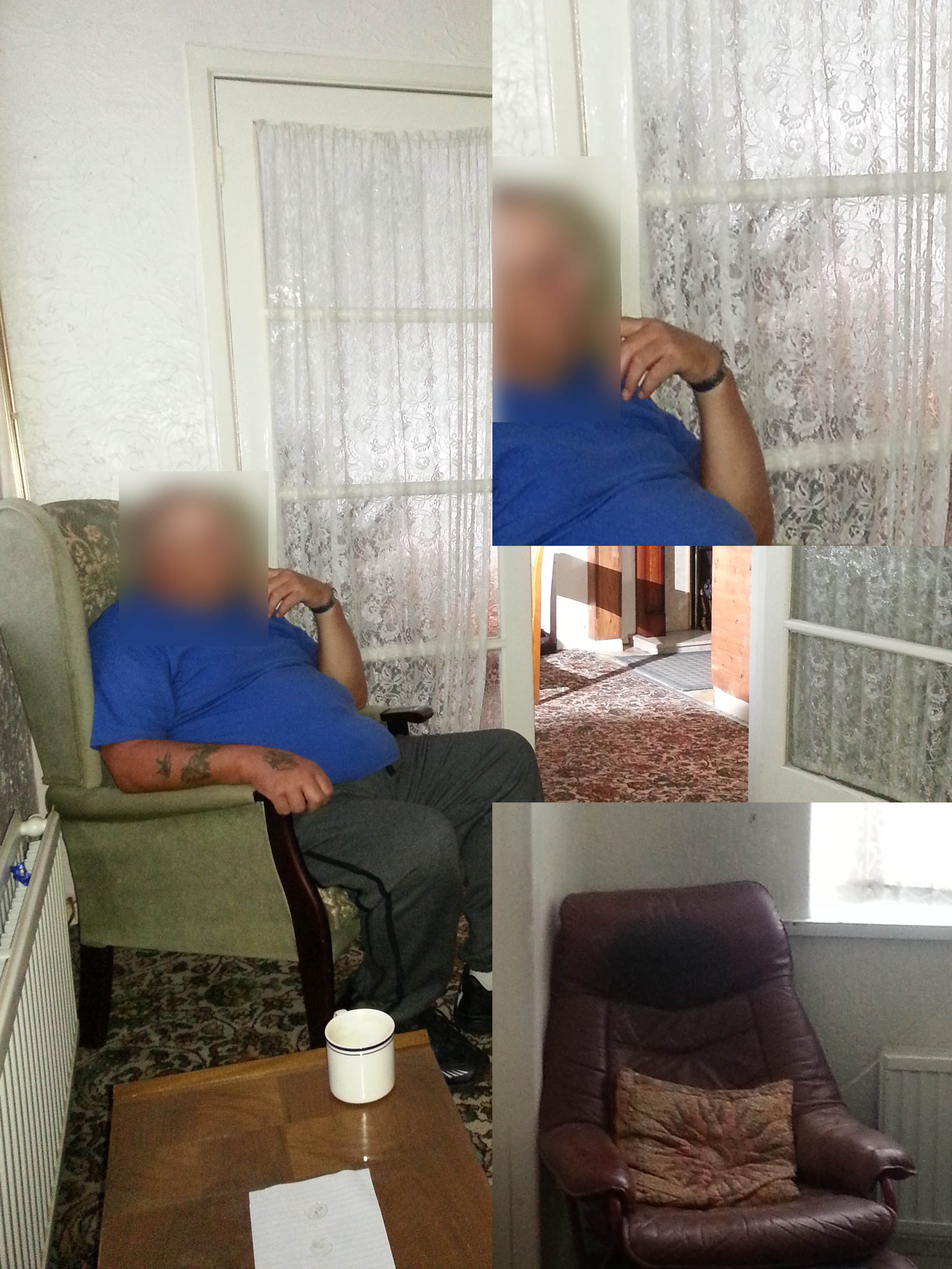 READING MAN (below): Notice the form of what appears to be a man sat reading behind the French doors to the kitchen. There was definitely no one in that part of the house at the time and definitely no casual reading of any material at any time that day. The chair sat in that corner behind the door is pictured bottom right. Photographer: Andy E