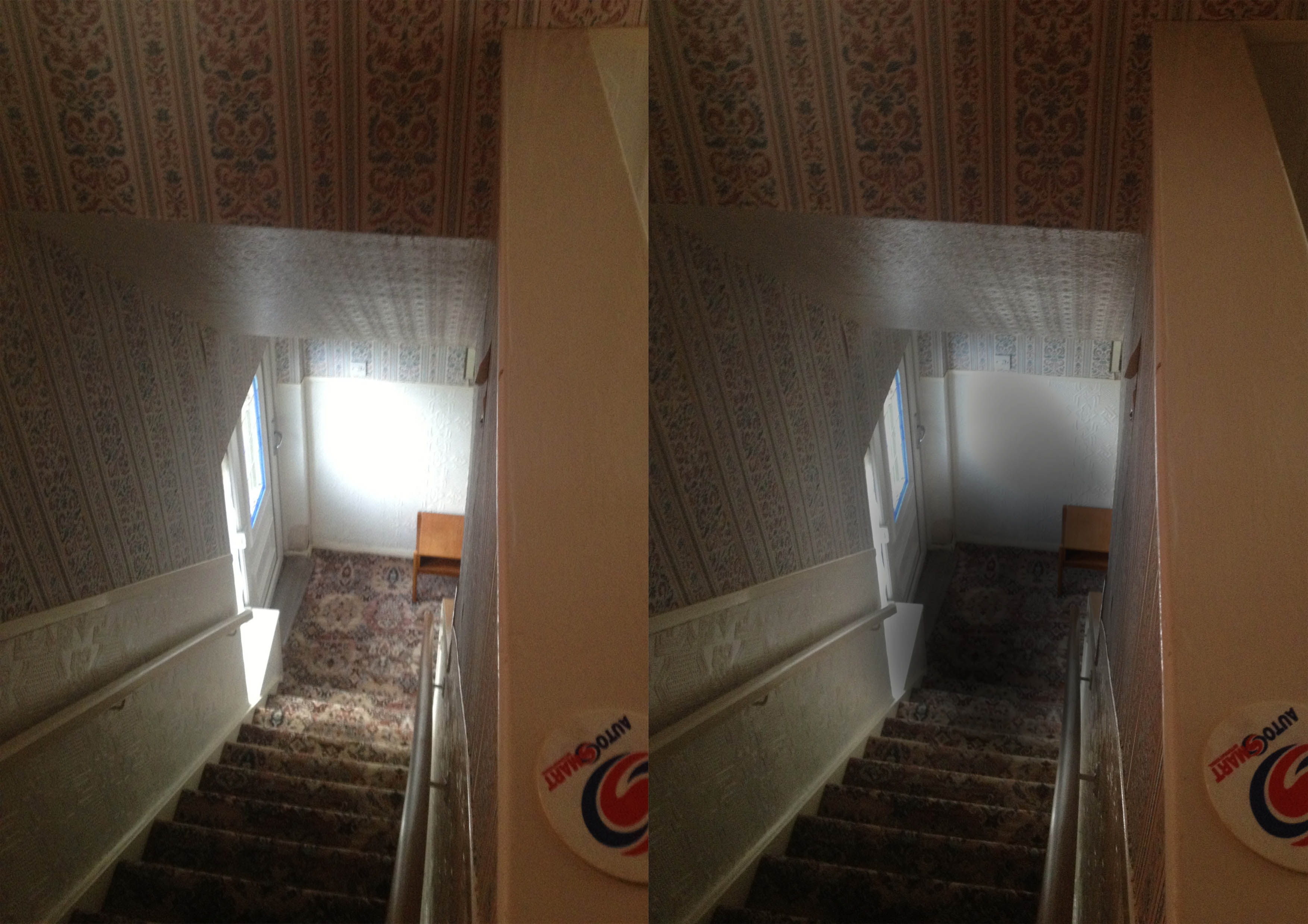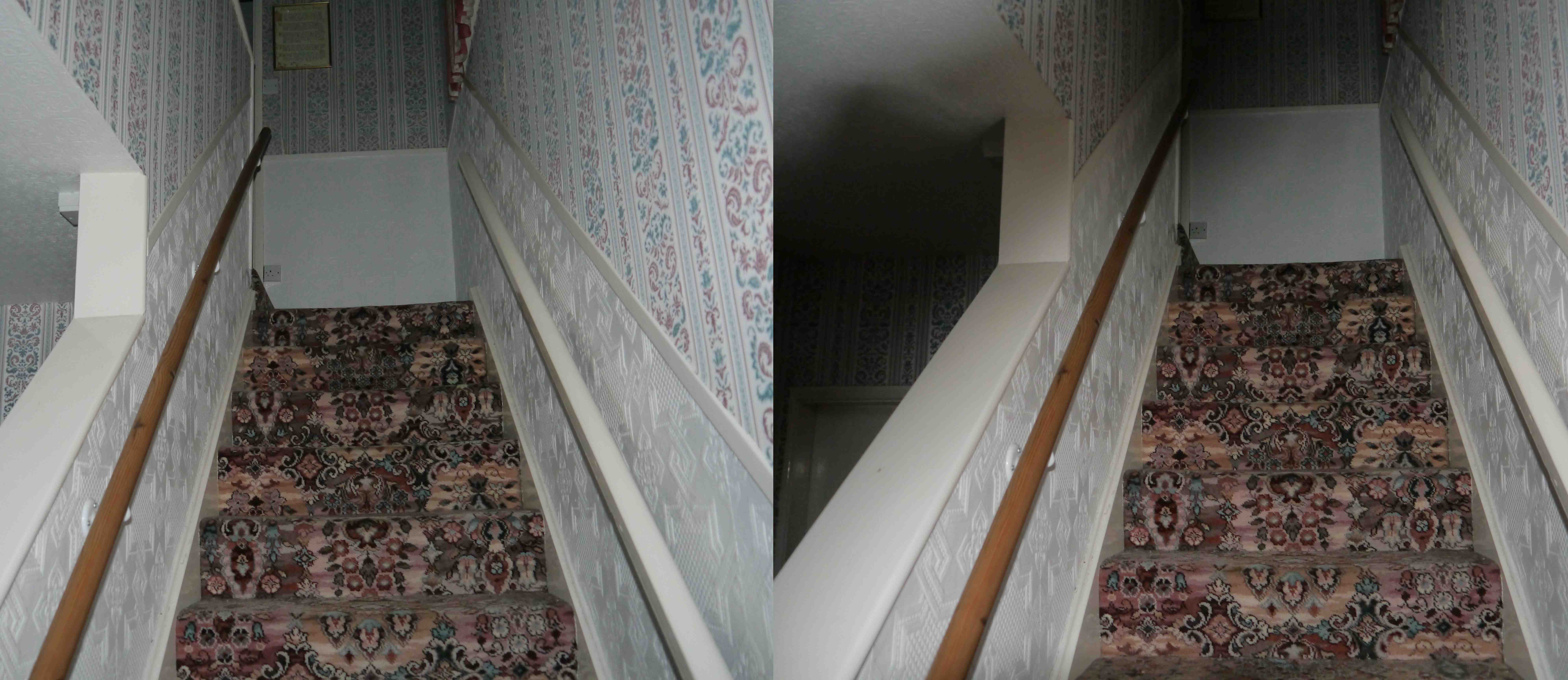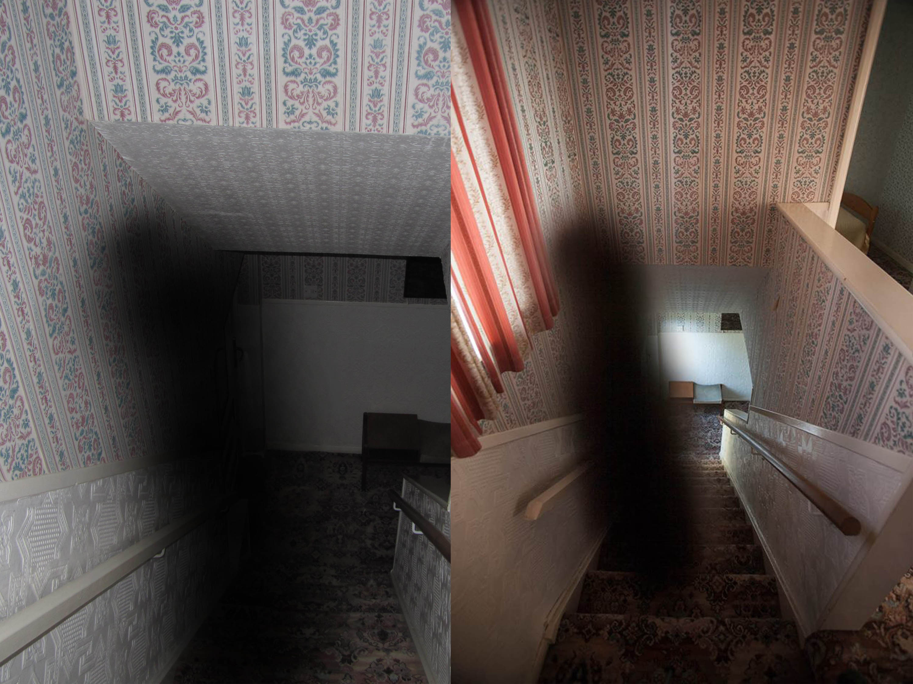 “HE’S AT THE BOTTOM OF THE STAIRS WATCHING YOU” (below): Two images taken in quick sequence clearly showing an anomaly in the right image. Carol the neighbour (and Medium) will occasionally point out to visitors that ‘he’ is stood at the bottom of the stairs watching, plus a ‘blue ball of light’ has been spotted a couple of times in the front door window on the left by passers by. Photographer: Andy E