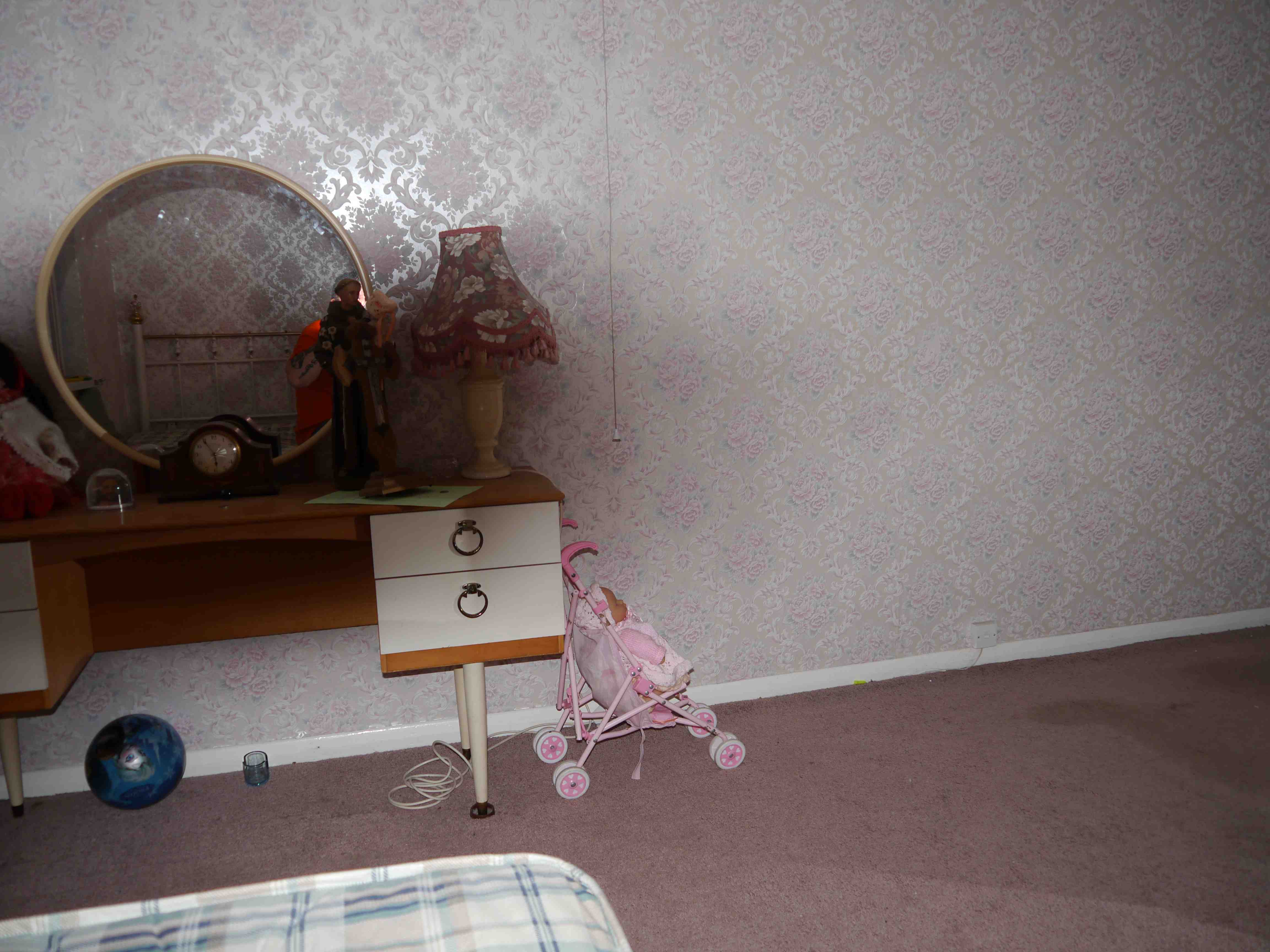 SHADOW ANOMALY 2 (below): Continuing on from above – the only way that this ominous, dark, tight shadow could possibly be achieved (other than photographing a genuine anomaly) would be a carefully positioned object in front of the flash – a wayward finger at a stretch. Also strange are the presence of the child’s pram, ball and snow shaker; they are always returned to ‘Diane’s Room’ but are often found elsewhere. Photographer: Steven J