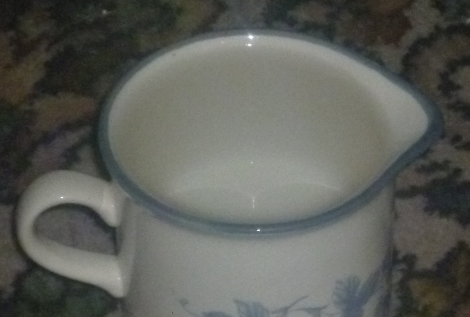 The visitors used this little jug to fill up a dog bowl, they left the jug on the front room floor. The visitors chatted for a little while, then checked to see if the dog had drunk its water – only to discover that the JUG HAD FILLED ITSELF BACK UP! You can see the original picture below and a close up below that, where you can see some light refracting at the bottom of the jug indicating the presence of water and a glint of light on the edge of the water showing that the jug is filled to the very brim. Showing off or being decent? You decide! Photographer: Amanda M