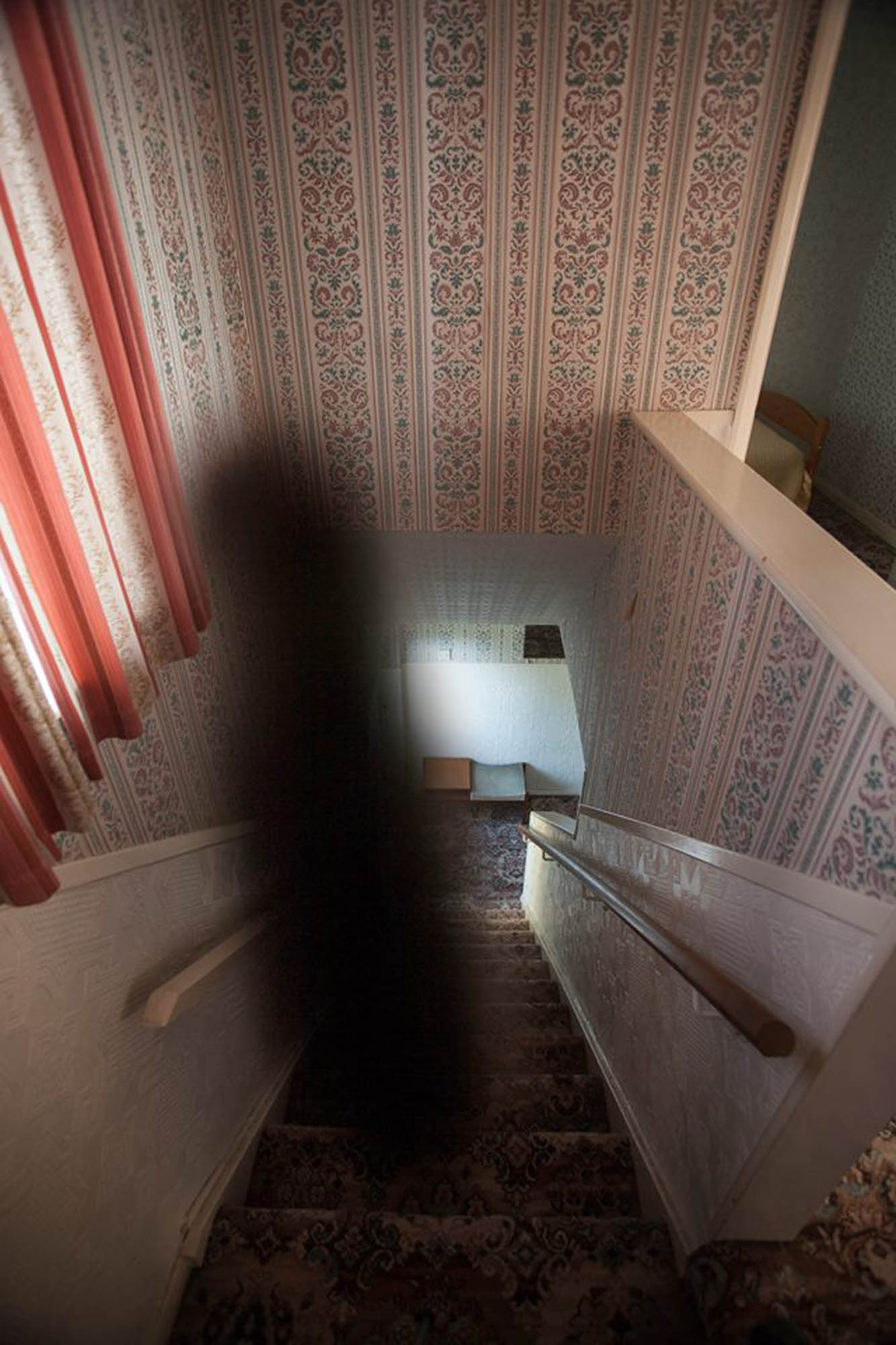 STAIR THREAT (below): Two images taken in sequence from a camera fixed at the bottom of the stairs, the second seems to show a shadowy presence. Visitors are often advised to hold on while they descend this claustrophobic stairwell because of the occasional shove to the back from an invisible assailant – it this that assailant itself? Photographer: Andy E